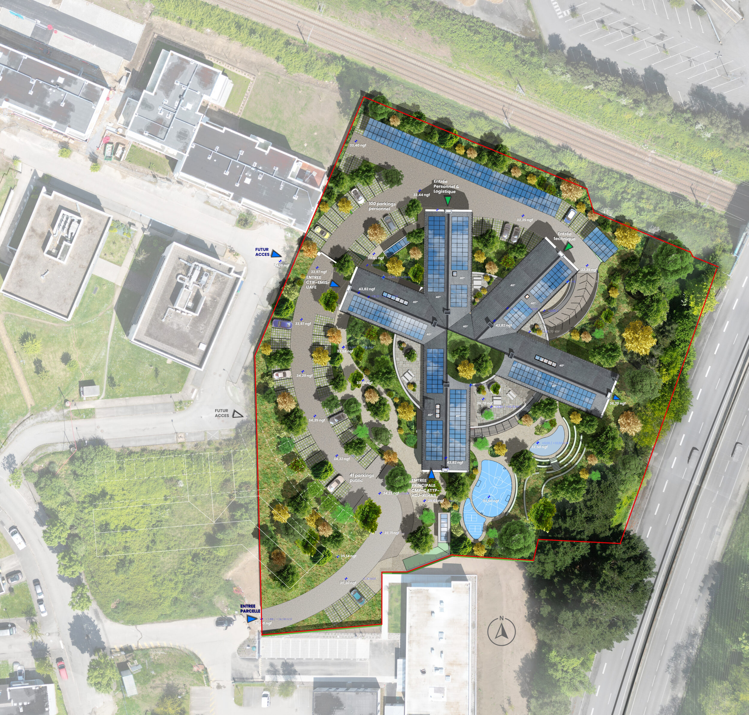 Le merlon arboré existant agit comme un écran climatique et paysager, protégeant le site et abritant un jardin thérapeutique conçu comme un lieu de calme, de déambulation et de respiration.